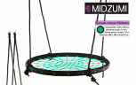 Качели-гнездо Midzumi выполнены из металлической рамы диаметром 100 сантиметров, с дополнительной защитной оплеткой ее бортиков, обтянутых прочным синтетическим канатом толщиной 10 мм выдерживающим нагрузку 100 кг. Плетеное синтетическое сидение качелей удобное и практичное, не собирает грязь и воду, при сильных загрязнениях его можно протереть.